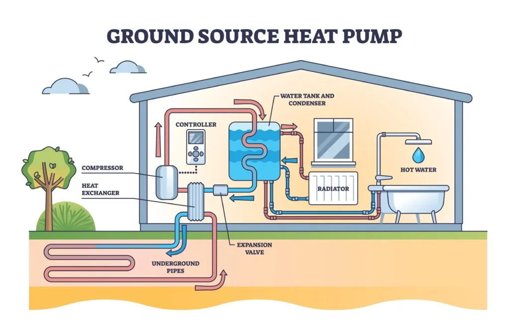 nlike gas boilers, which rely on burning fuel, GSHPs make use of renewable energy that’s available all year round. Pipes are buried underground, either in a horizontal trench or vertical boreholes, where they absorb stable ground temperatures to generate heat for your home.